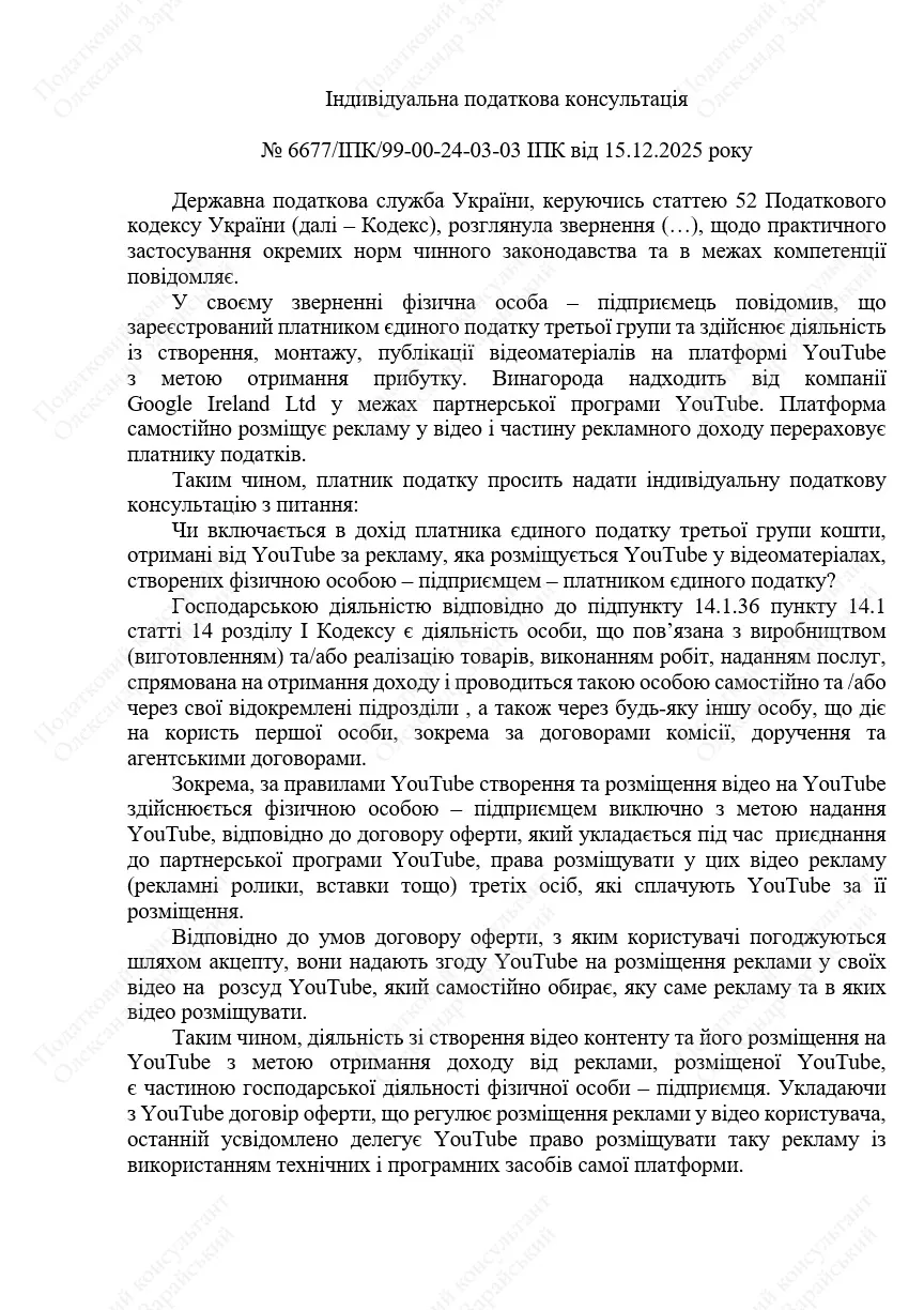 «Таким чином, якщо фізичною особою – підприємцем – платником єдиного податку отримується дохід у вигляді винагороди за перегляд іншими користувачами YouTube чи іншого веб-сайту реклами перед, під час та після показу відео на сторінці перегляду, а також поруч із власними роликами користувача, то сума такого доходу у розумінні Кодексу не є роялті»