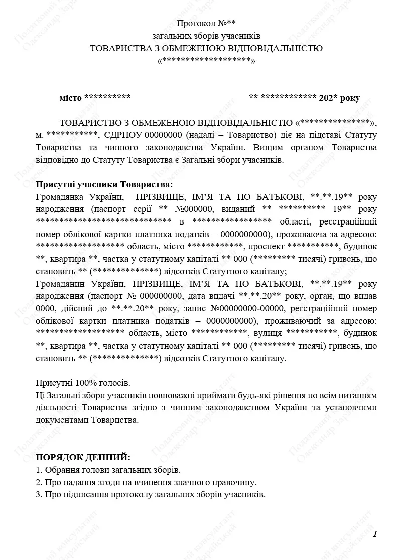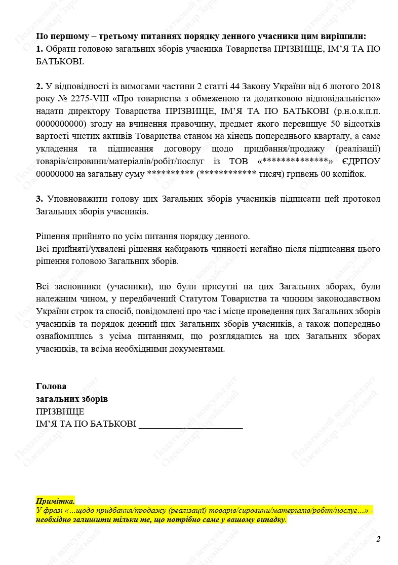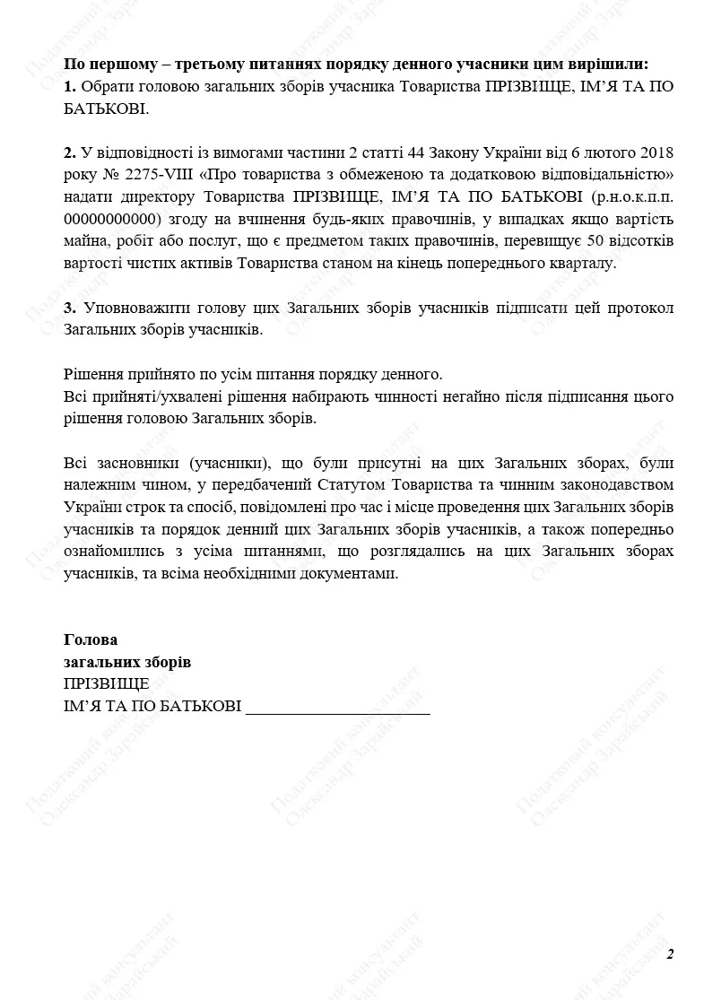 2. Рішення про надання згоди на вчинення правочину, якщо вартість майна, робіт або послуг, що є предметом такого правочину, перевищує 50 % вартості чистих активів товариства станом на кінець попереднього кварталу, приймаються виключно загальними зборами учасників.
